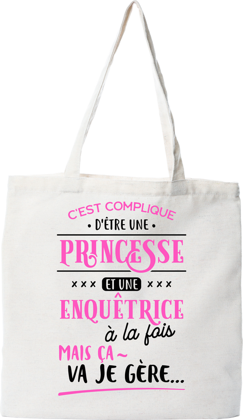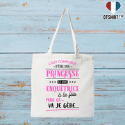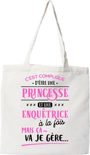 Tote bag coton recyclé princesse et enquetrice Une citation drôle et touchante. Un classique et une assurance de faire plaisir. Le cadeau idéal, imprimé en France, Sac en toile 145gr, 70% coton recyclé - 30% polyester recyclé, 42cm x 37cm. Otshirt est une marque déposée.
