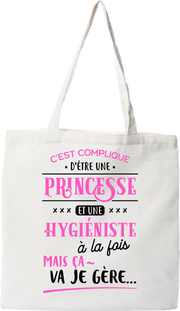 Tote bag coton recyclé princesse et hygiéniste Une citation drôle et touchante. Un classique et une assurance de faire plaisir. Le cadeau idéal, imprimé en France, Sac en toile 145gr, 70% coton recyclé - 30% polyester recyclé, 42cm x 37cm. Otshirt est une marque déposée.